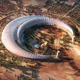 Project spans 160 hectare, and features futuric botanical gardens. The main buildings, totaling 20 hectars of construction, are formed as two interlocking crescents, and will house different environments thru a series of controlled environments.