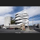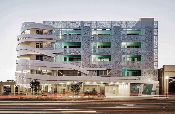 Custom perforated rainscreen with crurved facade bands.